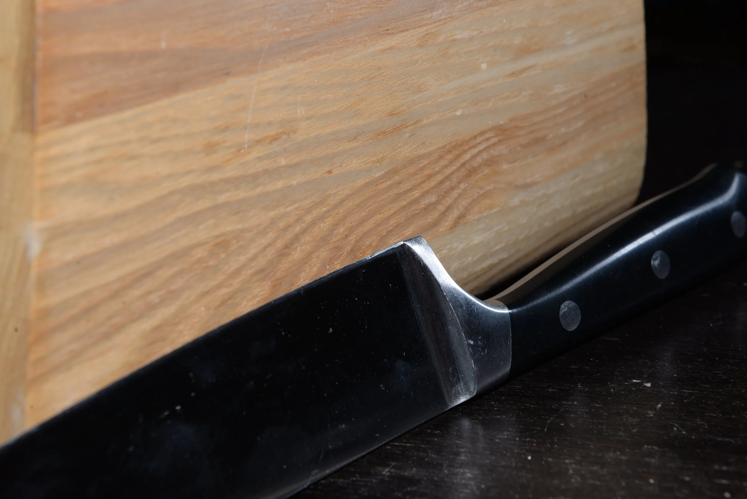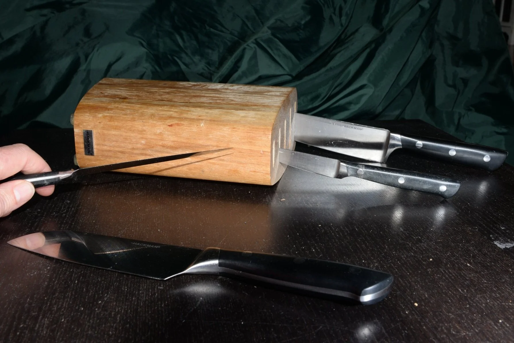Asiakas toi siis veitset telineessä, joka on oletettavasti tammea (en tarkastanut). Sitä varmaan säilytetään lähellä tiskiallasta, sillä toinen sivu oli hieman saanut roiskeita.